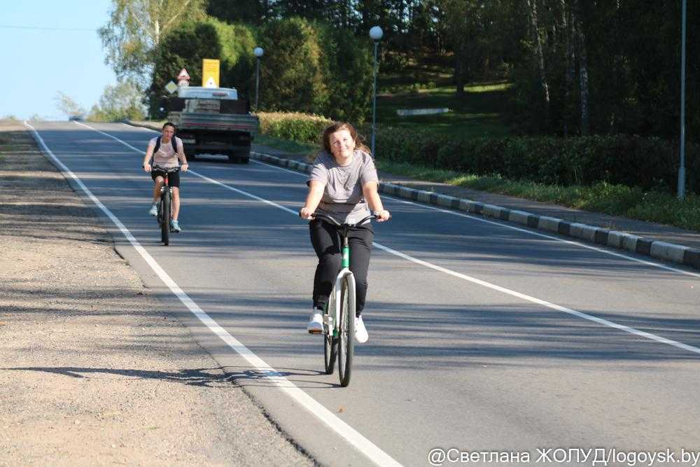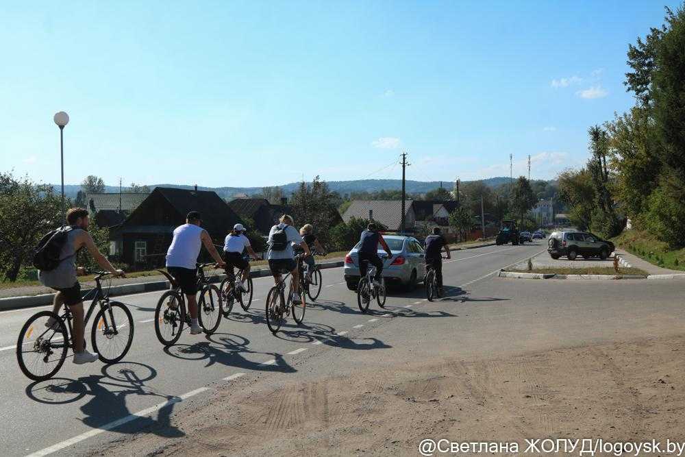 Памятное фото перед стартом и велосипедисты во главе в начальником райинспекции Инной Белановской в сопровождении экипажа ГАИ отправились по маршруту Черный Лес-Гостиловичи-Логойск.