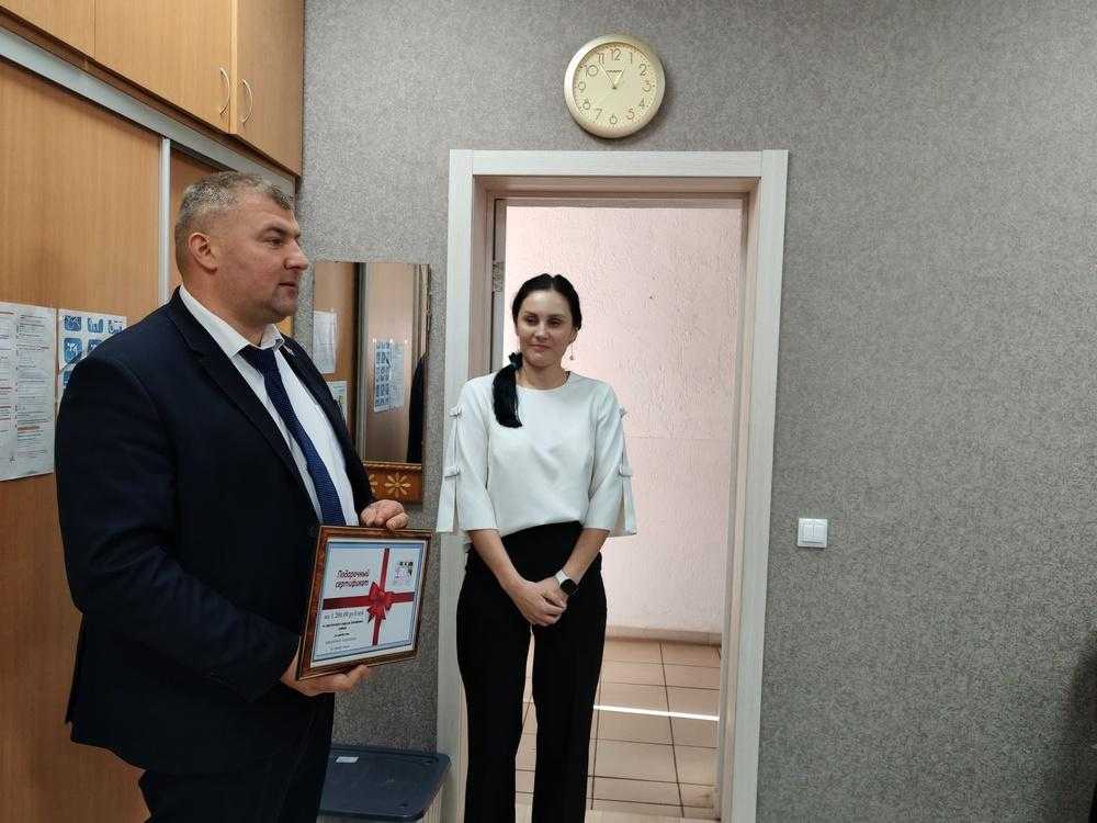 Вручая сертификат на 1200 рублей заведующему отделением Нине Соболь, он подчеркнул, что депутатскую инициативу поддержало иностранное предприятие "Флекс Групп".