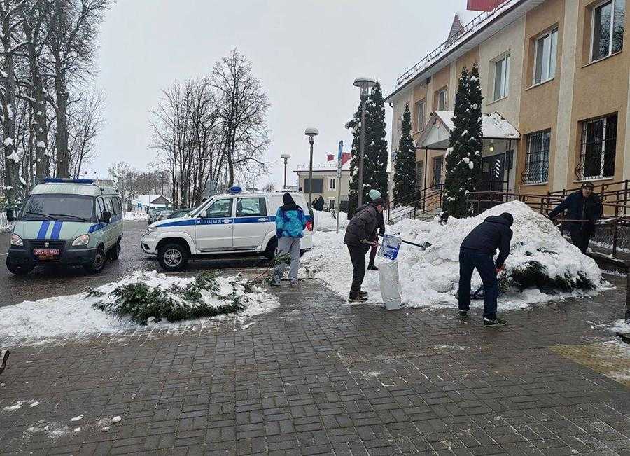 После мероприятия в сопровождении сотрудников Логойского РОВД данные лица были задействованы на уборке снега возле райисполкома и райотдела милиции.