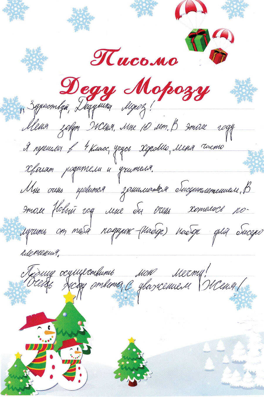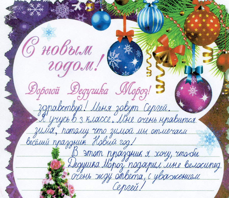 «Здравствуй, дорогой Дедушка Мороз! Как твое здоровье? Как ты поживаешь? Как дела у Снегурки и твоих оленей? Пишет тебе Дима. Мне 12 лет. Я учусь в 7 классе. А живу вместе с мамой, папой и младшим братиком. Я очень люблю собак и котиков, поэтому у меня дома живут Юк, Барбос и Карай. Мне нравится играть в развивающие компьютерные игры. Я собираю фигурки из «Лего». А еще я люблю заниматься спортом. У меня очень хорошо получается бегать. В этом году я вел себя не очень хорошо, но я стараюсь: помогаю маме и папе, не обижаю братика. Успехи в учебе улучшились. Я очень мечтаю о наборе «Лего». Подари, пожалуйста, моему братику «железную дорогу». Мама обрадуется набору для рукоделия, папа — новым инструментам, бабушке с дедушкой принеси здоровья, а котам и собакам вкусного корма. Дедушка Мороз, поздравляю тебя с Новым годом! Желаю тебе здоровья и много сил!