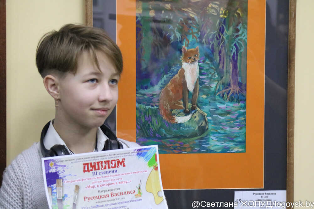 Познакомилась и еще с одним представителем этой школы искусств – Василиной Русецкой. Ее работа отмечена дипломом 3 степени. На первом плане мы видим лису, но как отметила автор – это необычное измерение и проход куда-то вдаль. Философия искусства.