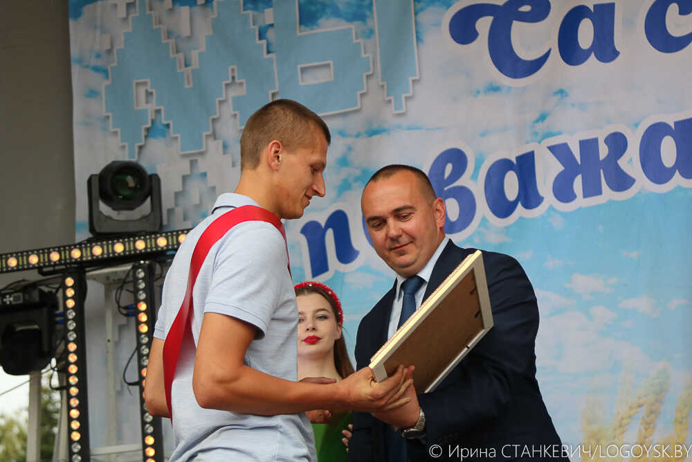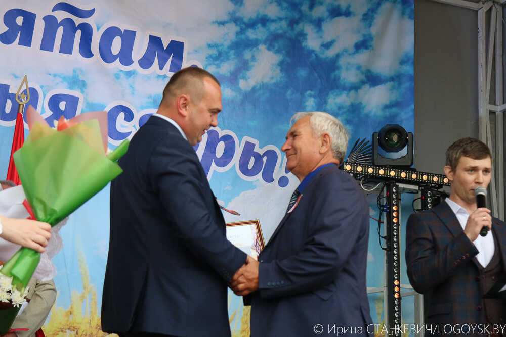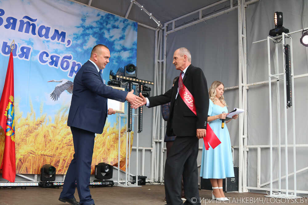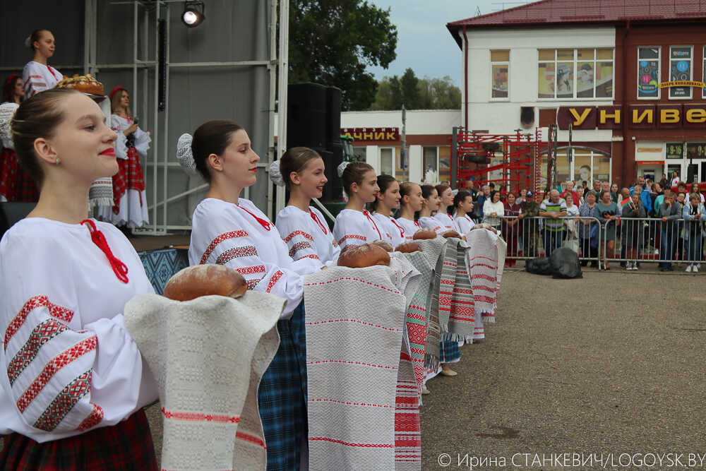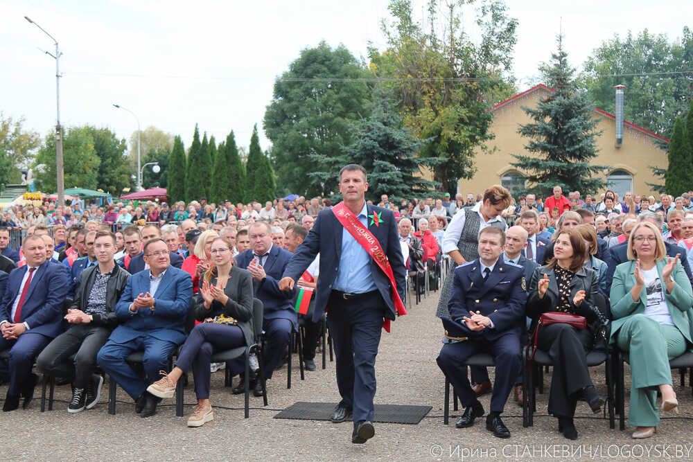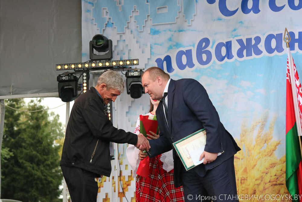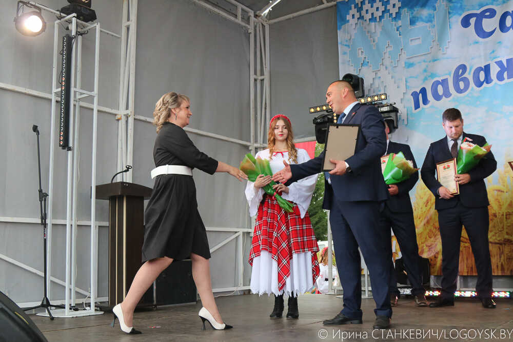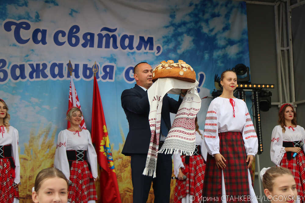 Однако перед тем, как поздравить их, председатель райисполкома Александр Ласевич принял от юных артисток, открывших торжественную часть, главный каравай района.