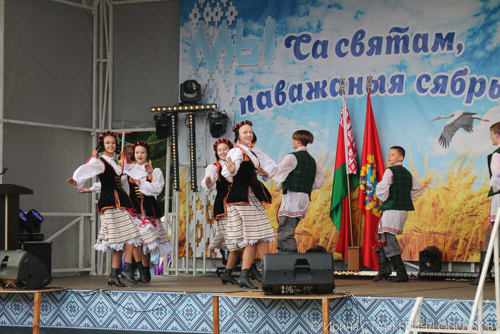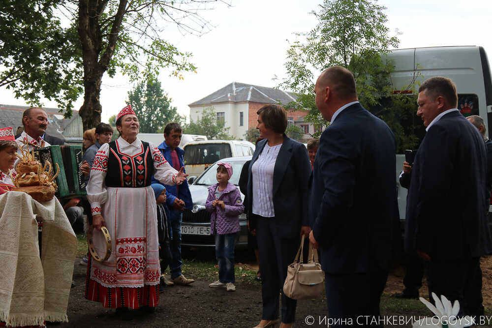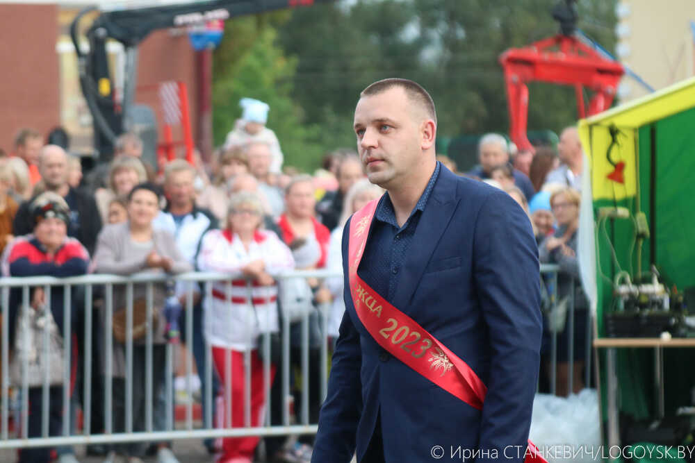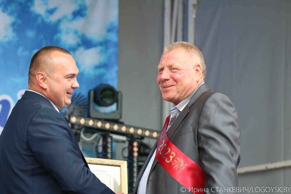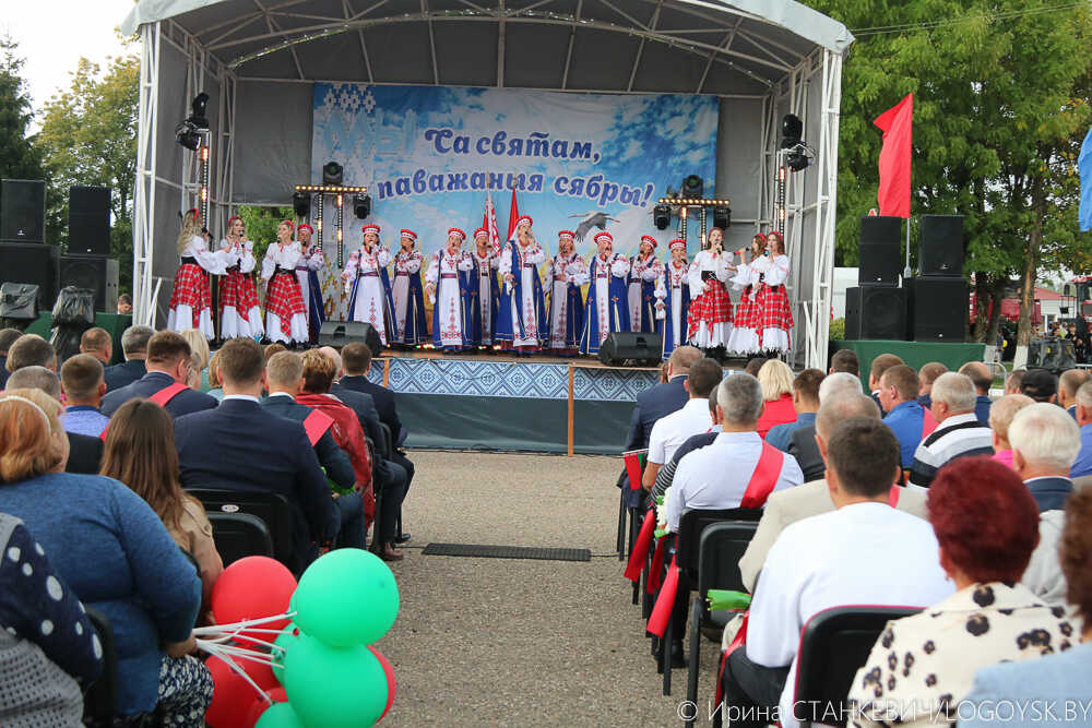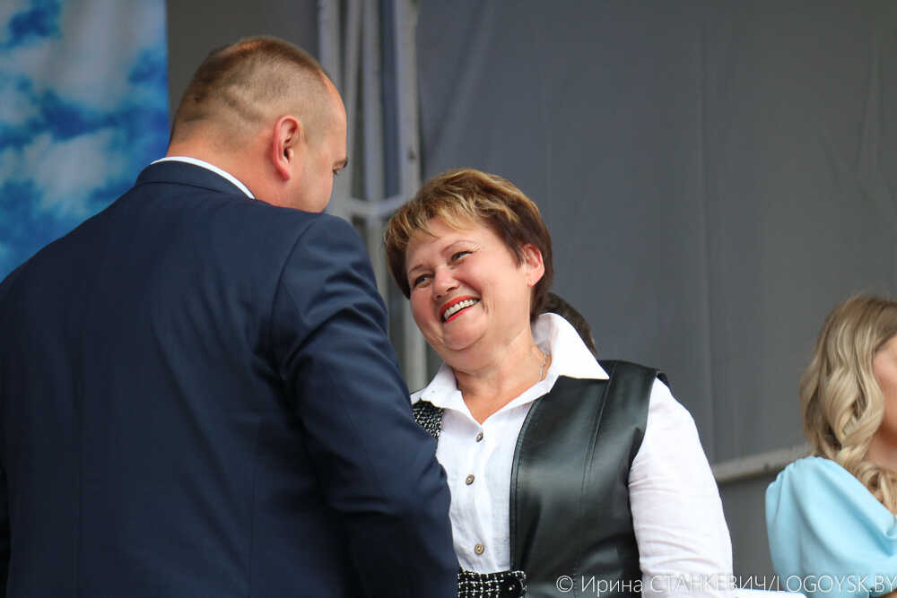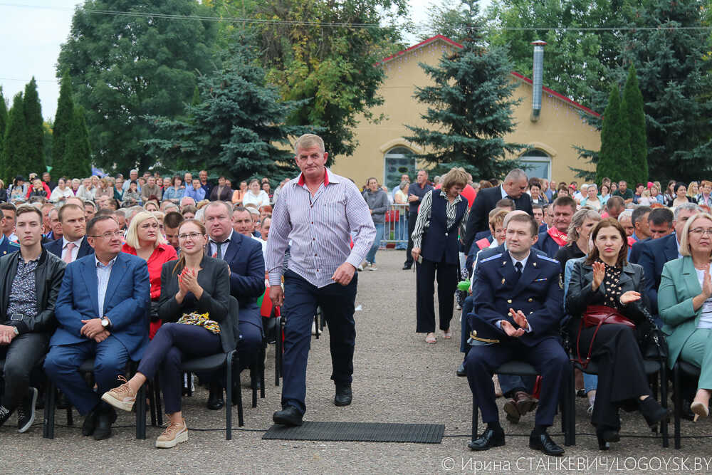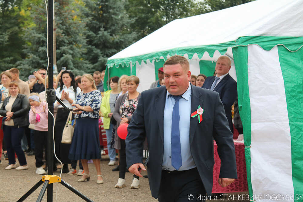 Однако перед тем, как поздравить их, председатель райисполкома Александр Ласевич принял от юных артисток, открывших торжественную часть, главный каравай района.
