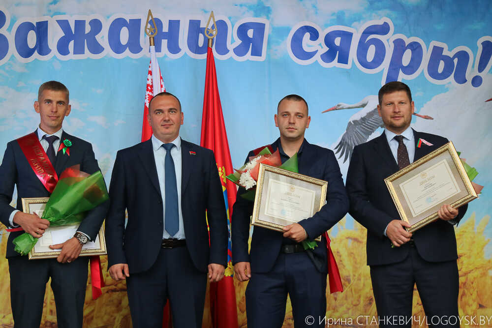 Лидерами среди комбайнеров стал экипаж Николая Мытника и Вадима Петраковского из СК "Логойский". Они обошли своих коллег-трехтысячников Сергея Рудака и Павла Навицкого, занявших второе место, а также Андрея Синюковича и Владимира Синюковича. Тут нужно сказать, что при подведении итогов учитывается не только общий намолот, но и марка комбайна, срок его эксплуатации. И все эти факторы складываются в тонны условного зерна, которых лидеры намолотили 1859,59.