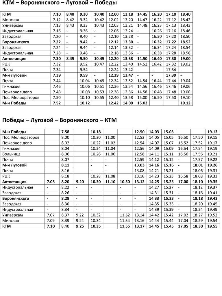 Обратно прямой рейс отправляется от Мелиораторов 6.50, 8.05, 8.45 и 12.00. Из микрорайона «Победы» без заездов до КТМ в 12.38, 13.18, 13.58, 14.38, 15.38, 16.28, 17.08, 18.08.