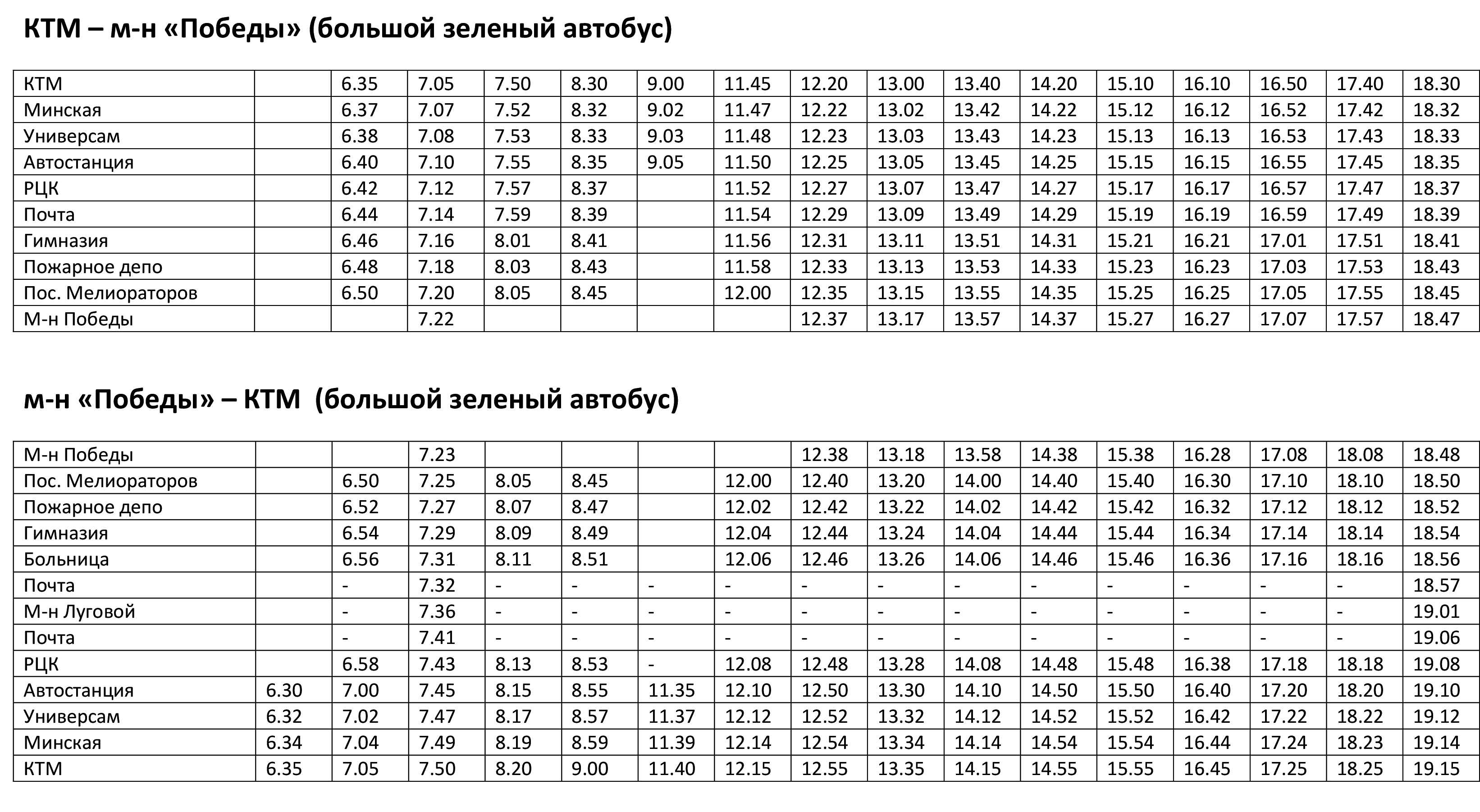 Так, начиная с конца октября прямой автобус от КТМ до поселка Мелиораторов отправляется в 6.35, 7.50, 8.30, 11.45. В 7.05, а также 12.20, 13.00 13.40, 14.20, 15.10, 16.10, 16.50, 17.40 и в 18.30 до микрорайона «Победы». Маршрут от КТМ в 8.40 (маленький) и 9.00 (большой зеленый) идет только до автостанции.